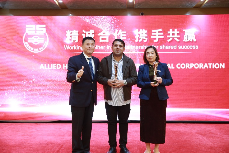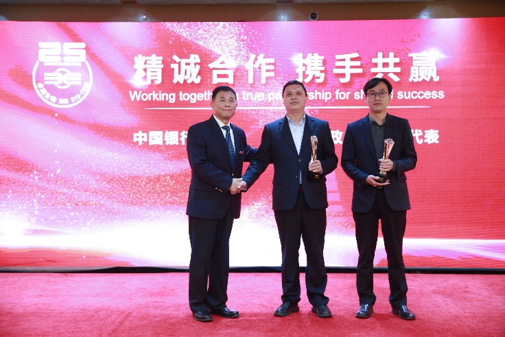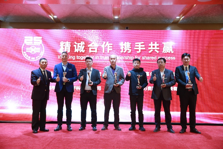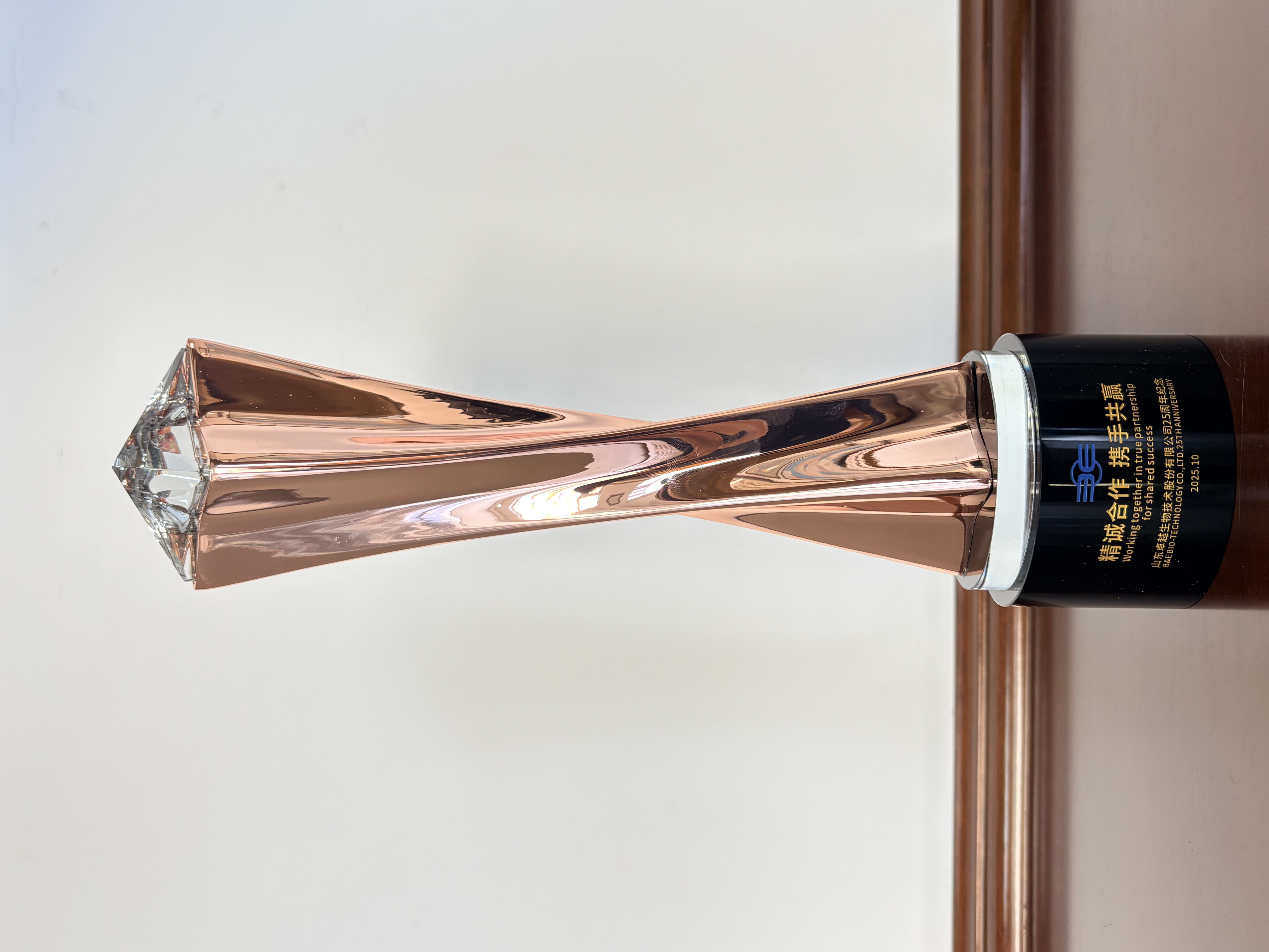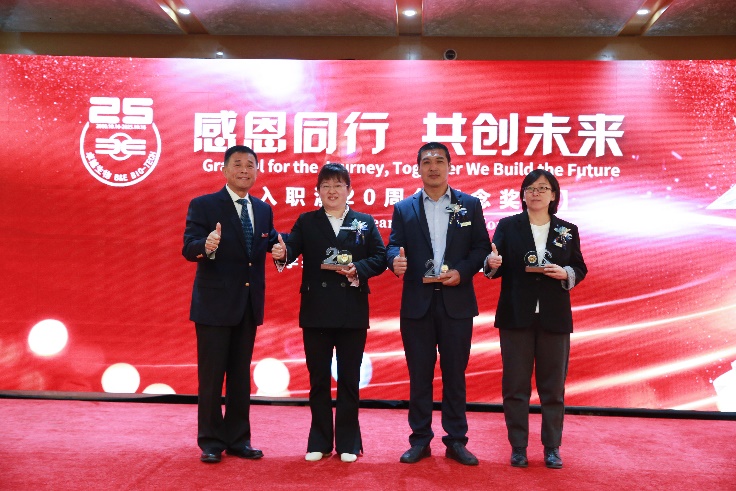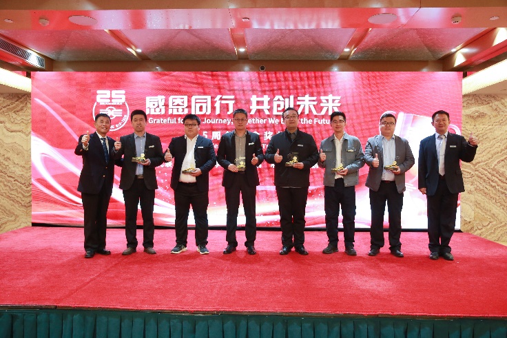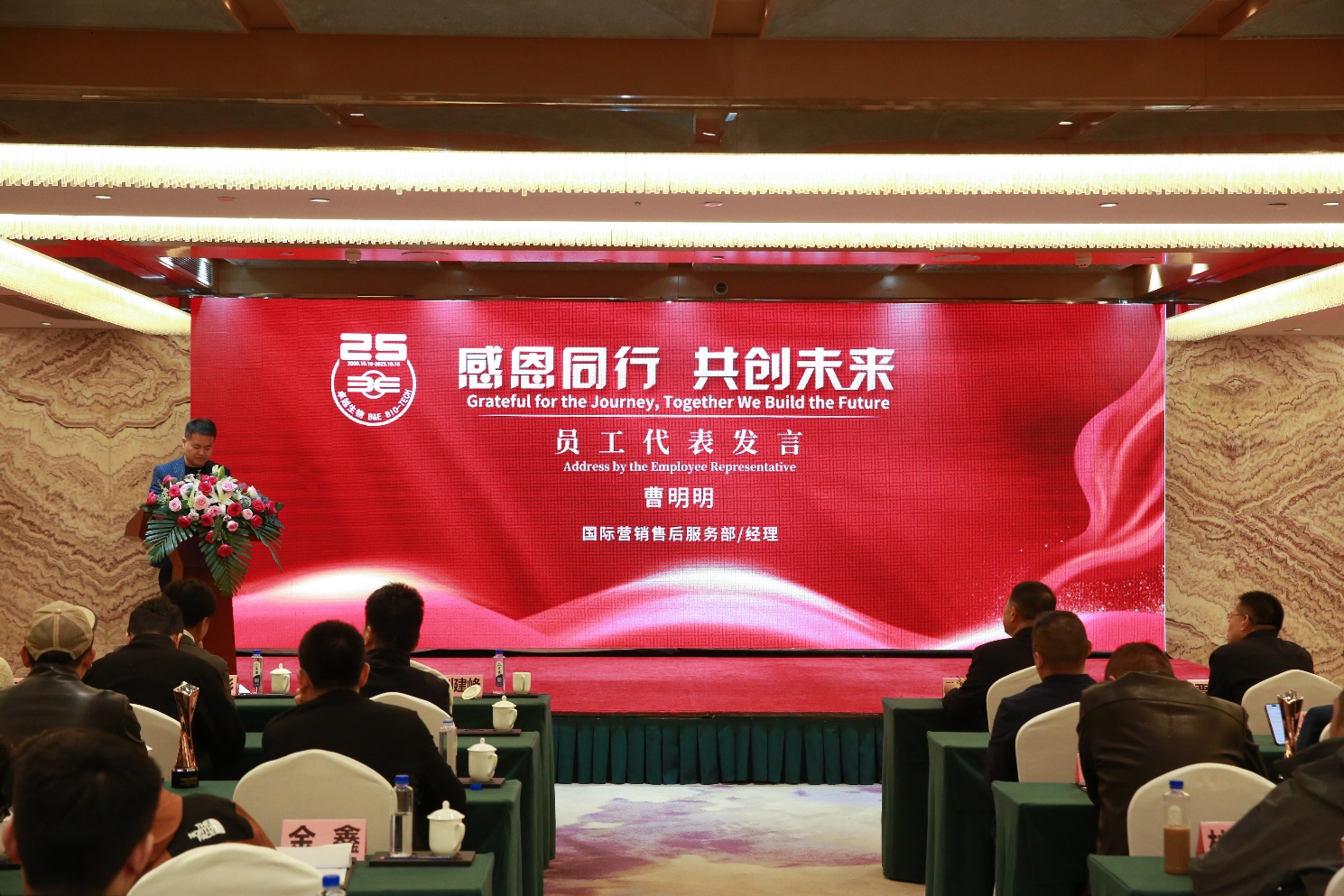 在隆重的颁奖环节中,公司先后为到场的10余家国内外经销商代表、6家供应商代表以及2家银行代表颁发了“精诚合作 携手共赢”奖杯,感谢他们多年来的信赖与支持;随后,为入职满10年及以上的6名员工代表颁发了公司成立25周年纪念奖杯,致敬他们与企业风雨同舟的坚守与奉献;更特别为入职满20周年的3名员工颁发了入职20周年纪念奖杯以及20g纯金纪念币,以表彰他们与企业共同成长、并肩奋斗的赤诚之心。